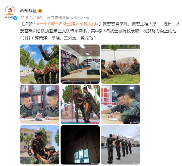 点赞!一个中队5名战士跨入军校大门 环球网 环球网官方账号 2022.08.2411:02 关注 来源:西部战区 武警警官学院、武警工程大学……近日,从武警兵团总队执勤第三支队传来喜讯,某中队5名战士被院校录取!祝贺努力向上的他们。(郭策泽、李晓、王刘宜、龚龙飞)