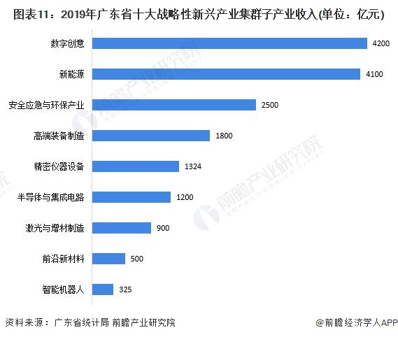 具体来看,根据2020年广东省发布的系列“战略性新兴产业集群行动计划”,2019年数字创业产业收入最高,达到4200亿元左右;排名第二的是新能源产业,收入在4100亿元左右;安全应急与环保产业收入规模排在第三位,为2500亿元。
