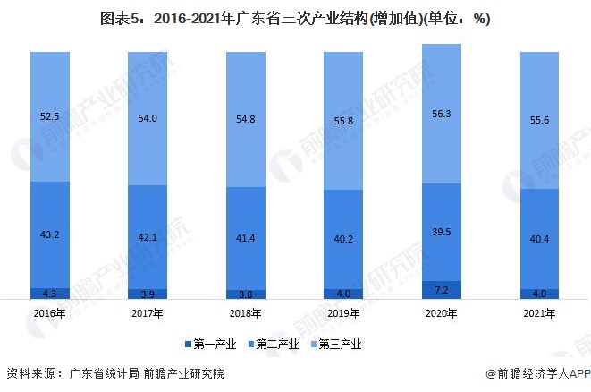 广东省产业结构呈现“第二、三产业”主导的局面,且近年来产业结构较为稳定。2021年广东第一产业增加值对地区生产总值增长的贡献率为4.2%;第二产业增加值对地区生产总值增长的贡献率为43.0%;第三产业增加值对地区生产总值增长的贡献率为52.8%。三次产业结构比重为4.0:40.4:55.6,第二产业比重提高0.9个百分点。