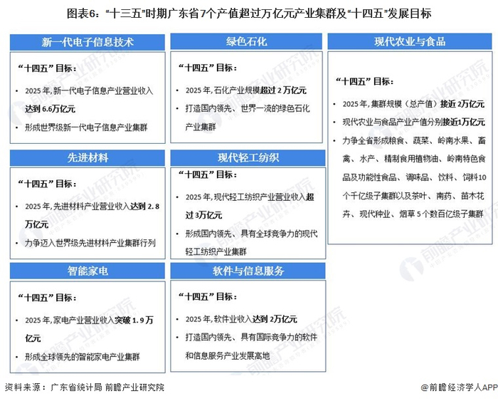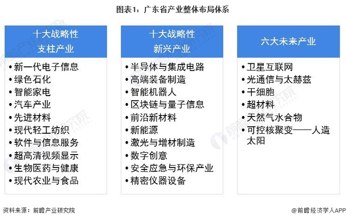 “十四五”时期,广东省提出了高起点谋划发展战略性支柱产业、战略性新兴产业以及未来产业的产业布局。战略性支柱产业是广东制造稳定器,包括绿色石化、智能家电、汽车、先进材料、生物医药与健康、现代农业与食品等;战略性新兴产业是广东制造推进器,包括半导体及集成电路、高端装备制造、智能机器人、区块链与量子信息、前沿新材料、新能源、精密仪器设备等;未来产业包括卫星互联网、光通信与太赫兹、干细胞等。