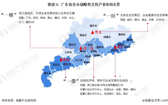 在产业空间布局上,广东省以功能区战略定位为引领,加快构建形成由珠三角地区、沿海经济带、北部生态发展区构成的“一核一带一区”区域发展新格局。