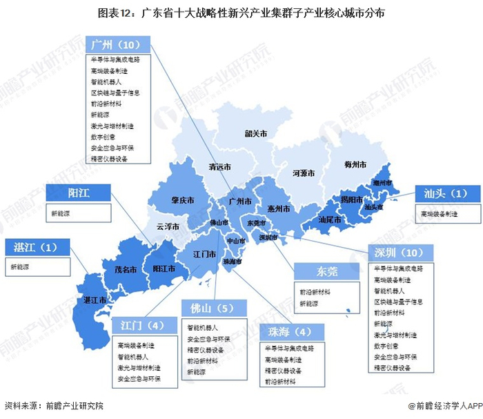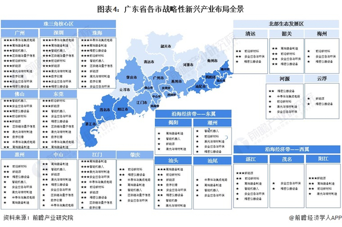 在战略性新兴产业方面,珠三角地区广州市、深圳市、珠海市、佛山市、东莞市和江门市布局较为全面;而沿海经济带和北部生态发展区仅在部分新兴产业方面重点布局。