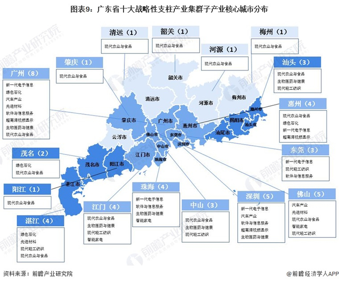 分区域看,以广州市作为核心城市发展的战略性支柱产业达到8个;以深圳市和佛山市作为核心城市发展的战略性支柱产业各有5个;以惠州、珠海、江门、湛江作为核心城市发展的战略性支柱产业各有4个。粤北地区清远、韶关、河源和梅州发展的重点集中在现代农业与食品产业。