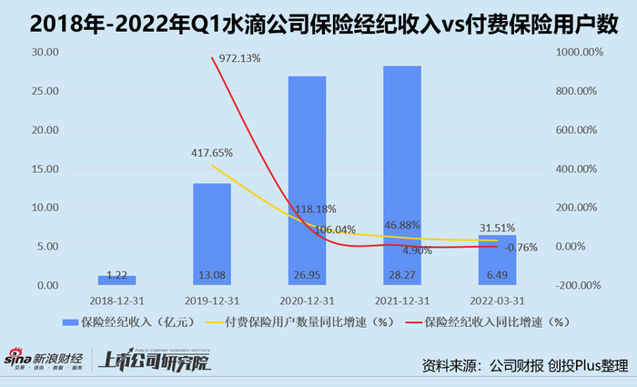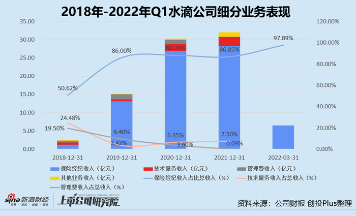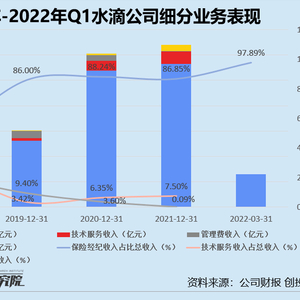 往期财报数据显示,公司的收入支柱是保险经纪业务。2018-2021年,保险经纪业务收入占总营收比例由50.62%增长至86.85%。2022年第一季度,水滴公司保险经纪收入为6.49亿元,占总收入的97.89%。