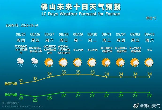 26日:阴天到多云,有中到大雨,25~32℃;