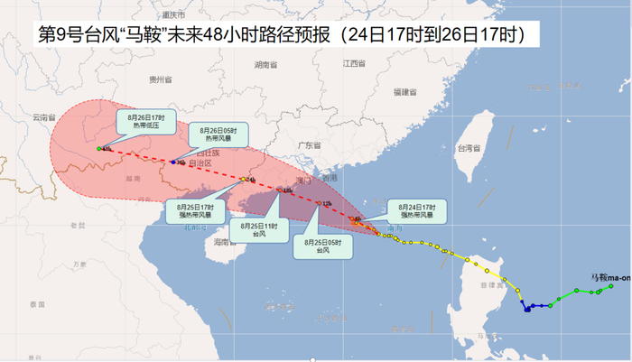 据佛山市气象台今日(8月24日)消息,今年第9号台风“马鞍”(强热带风暴级)24日18时中心位于距离佛山东南方向约410公里的南海东北部海面上,中心附近最大风力11级(30米/秒)。预计“马鞍”将以25到30公里的时速向西北方向移动,强度继续加强,25日早晨到中午以台风级在珠海到湛江沿海地区登陆。