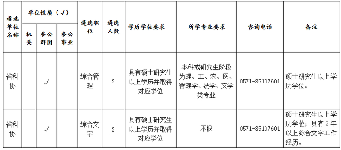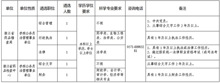 浙江省药品稽查局(省药监局直属参照公务员法管理事业单位)综合管理、行政执法、法律职位各1名,浙江省药品检查中心(省药监局直属参照公务员法管理事业单位)综合文字、财务职位各1名。