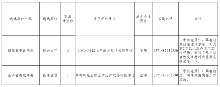 省委政法委拟遴选4名公务员,综合文字岗位3名,执法监督业务岗位1名。