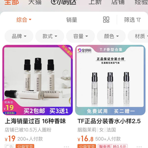 目前,在淘宝、拼多多等平台已然搜索不到左右化妆品的同名店铺,但以“香水分装小样”的关键字仍可以搜索到一些个人淘宝店铺在售卖相关产品。有些店铺会给不同品牌的香水设置单独链接,还有推出买二送一等小样礼盒活动。