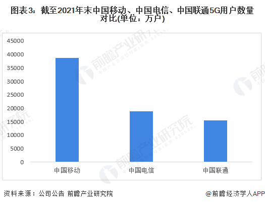 中国移动、中国电信、中国联通2021年运营数据显示,截至2021年末,中国移动用户总数达到95689万户;中国电信用户总数达到37243万户;中国联通移动出账用户累计达31712万户。