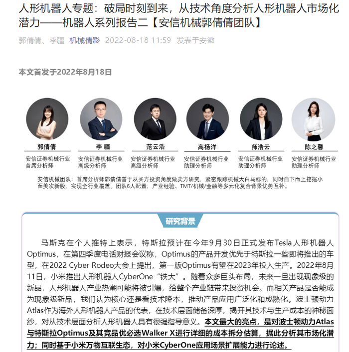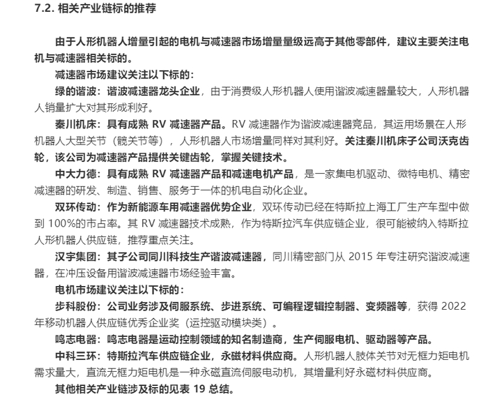 他表示,近期多家券商推荐的相关人形机器人概念股,包括减速器领域的双环传动、绿的谐波,伺服电机领域的江苏雷利、鸣志电器,控制器领域的汇川技术,热管理领域的三花智控等,其实谈不上是人形机器人的供应商。