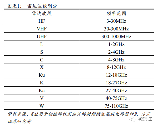 根据应用场景的不同,雷达所使用的频率也不同。目前使用最广泛的雷达频率通常都在 X-Band 以下,其中,L-Band 主要用于导弹预警,S-Band 主要是舰载警戒雷达的工作频率,C-Band 用在气象监测雷达上,X-Band 更多的用在机载雷达上。