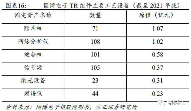 生产 TR 组件所需的生产设备包括贴片机、网络分析仪、键合机等。以国博电子为例,截至 2021 年年底,其机器设备原值为 5.14 亿,其中贴片机为 1.07 亿,网络分析仪为 1.02 亿,键合机为 0.58 亿。以雷电微力为例,在生产自动化方面,公司生产部门在 2015 年后,先后引入了全自动贴片机、全自动金丝键合机、自动水清洗设备、等离子清洗机等自动化设备。公司 2015 年前金丝键合机全部为手动键合机,自 2015 年开始,公司引入了 10 余台全自动金丝键合机,相关工序产能提升 50 倍以上,截至 2021 年年底,公司机器设备原值为 0.69 亿。