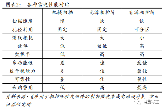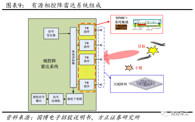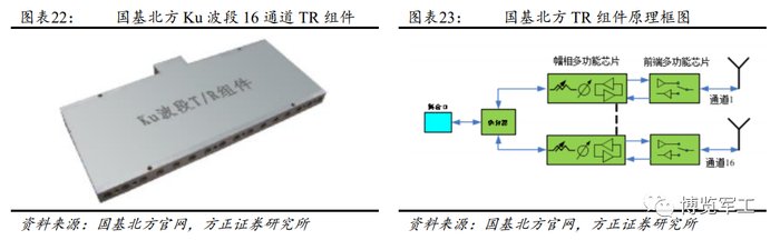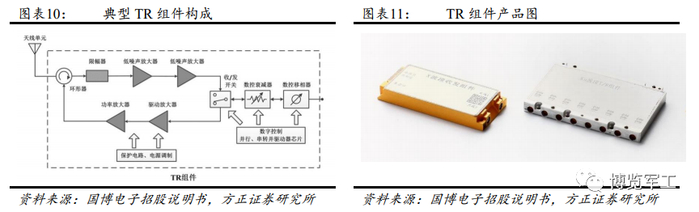 2)相控阵天线占相控阵雷达整机成本的一半以上,其主要由成百上千个 TR 组件构成。TR 组件市场包括整机单位内部配套和对外采购两种模式,国内大型雷达研究所包括电科 14 所、电科 38 所、航天二院 23 所均有自己的 TR 组件产线,而在弹载以及机载雷达方面,由于相控阵在该领域应用较晚,部分弹载和机载雷达总体单位目前以外购TR 组件为主,弹载相控阵雷达放量为 TR 组件专业厂商带来良好的发展机遇。