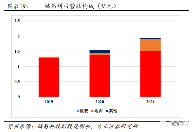 铖昌科技成立于 2010 年 11 月,2018 年由和而泰控股,2022 年完成分拆上市。公司主要从事相控阵 TR 芯片的研发、生产、销售和服务,主要向市场提供基于 GaN、GaAs 和硅基工艺的系列化产品以及相关的技术解决方案,产品目前主要应用领域包括星载、机载、舰载、车载和地面相控阵雷达中。2019-2021 年,公司星载相控阵 TR 芯片销售占比较高,分别为 96.40%、88.36%和 78.57%。卫星互联网方面,公司充分发挥技术创新优势,成功推出星载和地面用卫星互联网相控阵TR 芯片全套解决方案。