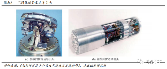 按照探测系统的不同,导引头主要可分为光学制导和雷达制导两大类。雷达导引头的体制在不断迭代,有源相控阵雷达导引头凭借灵敏度较高、信号处理能力较强、可靠性较高等特点,未来将逐步成为弹载武器的倍增器。