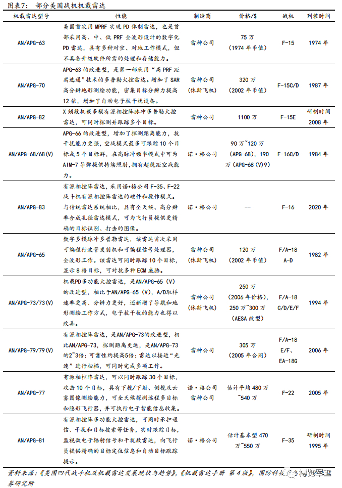 美国 F15、F16 和 F18 战机分别升级为相控阵雷达 AN/APG-82、AN/APG-83 和 AN/APG-79/79(V)。典型代表如 AN/APG-79,其 TR组件数量大约 1000 个左右,内部噪声下降 4dB 左右,加上双向传输损耗比机扫雷达低 5dB 以上,因此探测距离通常是该机型此前装备的机扫雷达的 1.5 倍,且实现空空、空地、空海、导航等多种作战功能。