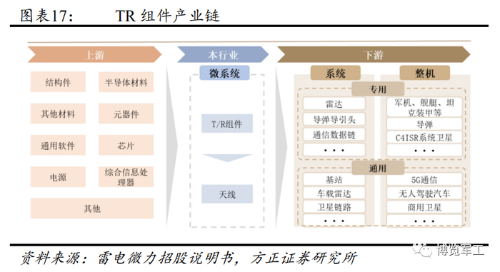 TR组件产业链上游为芯片、结构件、元器件等材料;中游为 TR 组件制造以及相控阵天线集成测试;下游为雷达、通信、电子对抗等整机。