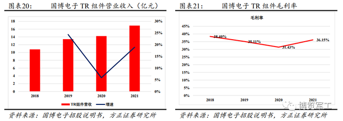 国博电子研制生产的有源相控阵 TR 组件采用高密度集成技术,利用先进设计手段和全自动化制造能力,为各型装备定制开发了数百款有源相控阵 TR 组件,具有体积小、重量轻、集成度高、性能优异等特点,目前已定型或技术水平达到固定状态的产品数十项,产品广泛应用于弹载、机载等领域。国博电子基于高密度、高可靠工艺制造平台,已具备年产数十万通道有源相控阵 TR 组件制造能力,是国内面向各军工集团销量最大的有源相控阵 TR 组件研发生产平台,除整机用户内部配套外,国博电子产品市场占有率国内领先。2021 年,公司TR组件收入达 16.91 亿元,占公司营业收入比例达 67%,毛利率为36.15%,同比增加  4.72%。