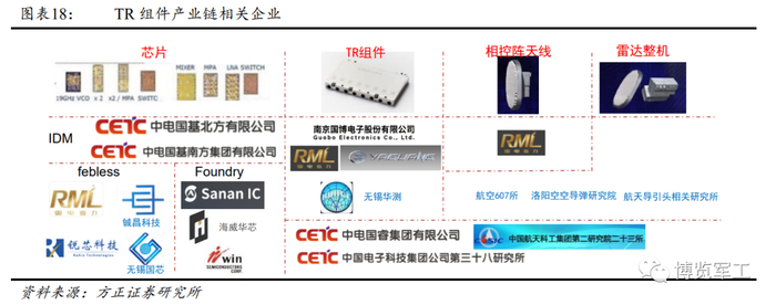 国内大型雷达研究所包括电科 14 所、电科 38 所、航天二院 23 所均有自己的 TR 组件产线,而在弹载以及机载雷达方面,由于相控阵在该领域应用较晚,部分弹载和机载雷达总体单位目前以外购  TR 组件为主。