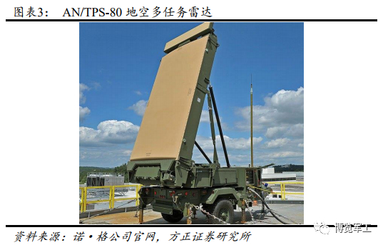 在地面警戒雷达领域 , 美国对空警戒雷达有陆基远程警戒雷达AN/FPS-108、AN/FPS-123、AN/FPS-132 等;地面可运输式警戒雷达AN/TPS-59、AN/TPS-63、AN/TPS-73、AN/TPS-80 等。地面可运输式警戒雷达向多功能化发展,如诺·格公司 AN/TPS-80 地空多任务雷达,采用有源相控阵体制,可应对多种威胁,如固定翼飞机、直升机、巡航导弹、无人系统,以及火箭炮、火炮、迫击炮等。该雷达采用最新的网络与数字化波束形成技术,具备多任务能力,将 AN/TPQ-46、UPS-3、AN/TPS-63、AN/MPQ-62 和 AN/TPS-73 雷达的空中监视、防空和反火力目标获取能力整合到一起,以一个雷达取代了美国海军陆战队五个单任务雷达,降低了运维成本并简化了训练难度。