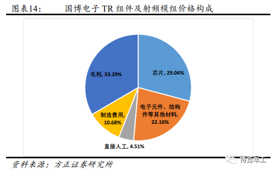我们暂简化认为公司直接材料中各产品的比例等同于公司过去三年采购产品的价值占比,则国博电子 TR 组件及射频模块的芯片成本占其销售收入的 29.05%,其他原材料包括电子元件、结构件、连接器等共计占 22.16%,制造费用和直接人工占比为 15.19%,毛利占比为33.29%。