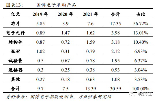 从公司采购产品看,2019-2021 年公司采购产品共计 30.59 亿元,其中芯片为 17.35 亿,占比达到 56.72%;电子元件占比为 13.01%,结构件占比为 10.40%,连接器为 3.04%。