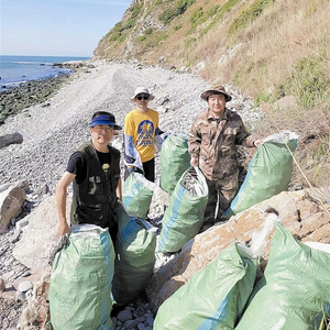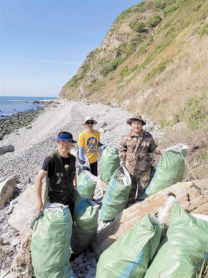 志愿者在清理海边垃圾。(左一孙宗伟左二王庆林)