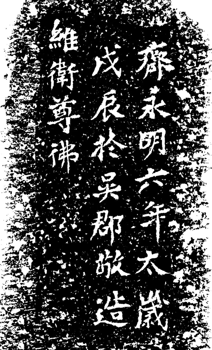 相比于摩崖碑碣,越中造像数量不多。著名者有越城维卫尊佛像,为南朝齐时造像,国家一级文物,现藏绍兴博物馆。像背镌刻“齐永明六年太岁戊辰,于吴郡敬造,维卫尊佛”铭文,对研究我国佛教史、书法史、雕刻史有重要意义。绍兴羊山石佛造像为隋唐石窟造像,石窟内壁有万历年间镌刻的《羊石山石佛庵碑记》:“隋开皇时,越国公杨素采羊山之石,以筑罗城,好事者因山凿石为佛,合以为庵。庵壁有古字,字隋唐间迹也。”新昌弥勒石窟造像,南朝齐梁佛教造像,开凿于南朝齐永明四年(四八六),成像于梁天监十五年(五一六),像高十四点零五米,其中头高四点三九米,被誉为江南第一大佛。