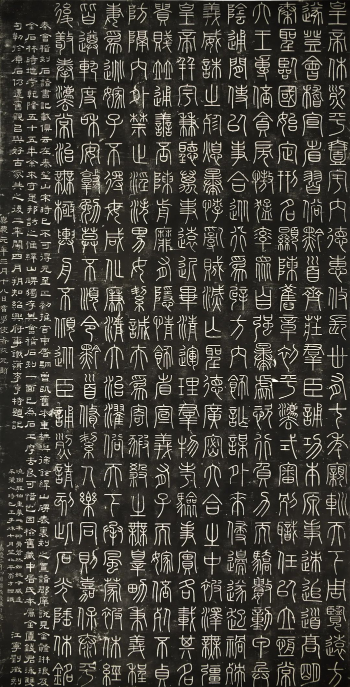 另有秦刻石翻刻二种,为一碑二面,分别为秦始皇流传于世七篇刻石中的第一篇《峄山刻石》与最后一篇《会稽刻石》,传皆为李斯所篆。刻石原存于绍兴府学,现存于大禹陵。正面为《秦会稽刻石》,据《史记·秦始皇本纪》载:“三十七年十月癸丑,始皇出游。上会稽,祭大禹,望于南海,而立石刻颂秦德。”原刻在宋时已不可得,现碑为元至正元年承德郎绍兴路总管府申屠据旧本所摹刻,后被磨去,至清乾隆五十七年绍兴府事李亨特请钱泳摹刻,重新上石。背面为《秦峄山刻石》,“至正元年岁在辛巳,二月初五日,承德郎绍兴路总管府推官鲁人申屠,以秦刻校徐摹,重镌于越庠之稽古阁”。杜春生《越中金石记》载:“考《杨东里续集》云:尝见陈思孝论《峄山刻石》翻本,凡七,长安第一,绍兴第二,浦江郑氏第三……”