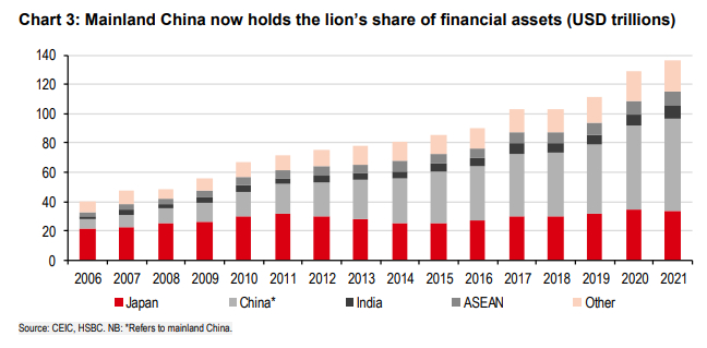 在2008年全球金融危机之后,亚洲的金融财富总量超过了美国。然而,尽管差距正在逐渐缩小,但该地区(不包括日本)的金融财富仍较低。汇丰表示,考虑到目前的人均收入增长趋势,到2025年,亚洲(不包括日本)的财富可能超过美国;不包括日本和中国,亚洲地区的金融财富约为美国的三分之一,而2006年这一比例还不到四分之一。