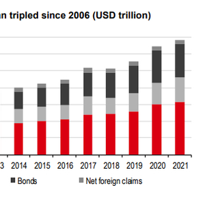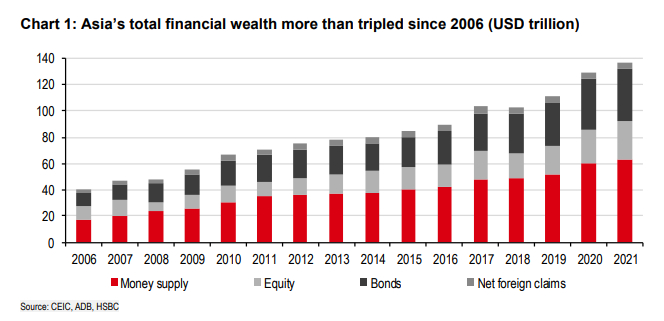 数据显示,从2006年以来,亚洲的金融财富总量增长了两倍,规模达到近140万亿美元。这些财富的大部分仍以银行存款的形式持有,而债券持有量略高于股票。随着时间的推移,这些资产各自的份额一直相当稳定。