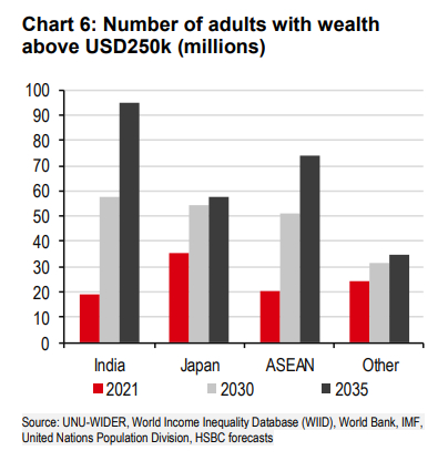 汇丰预计到2030年,越南、菲律宾和印度持有25万美元以上财富的人数将增加一倍以上,印尼和马来西亚则紧随其后。