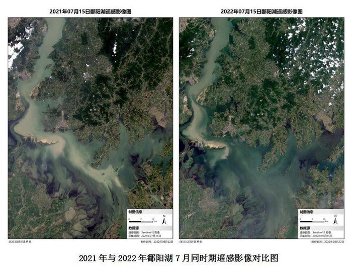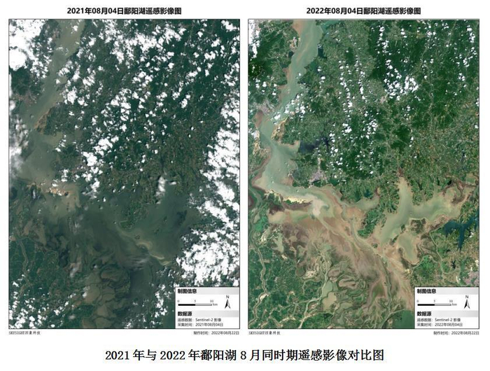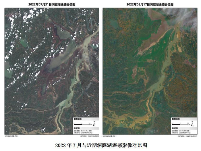 通过对比洞庭湖2021年与2022年7月同期、8月同期影像来看,洞庭湖在7月11日的水位与去年同期无明显下降;同时,对比2022年7月、8月的影像发现,洞庭湖水位大幅度下降,变得“骨瘦如柴”。