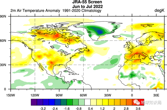 欧洲和北美大部分地区的温度都比往年正常温度高。