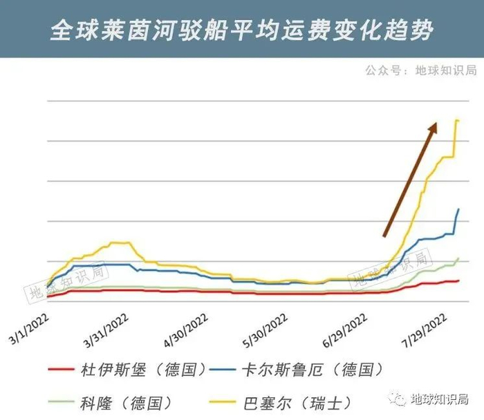 总部位于杜伊斯堡的德国最大内河船运公司HGK的发言人称:“3月初,航船还可以装载2200吨”,而现在只能装载600吨。减载就意味着运送同样的货物需要三倍的运输次数,由此推高的运输成本使得本来已陷入困境的德国经济雪上加霜。