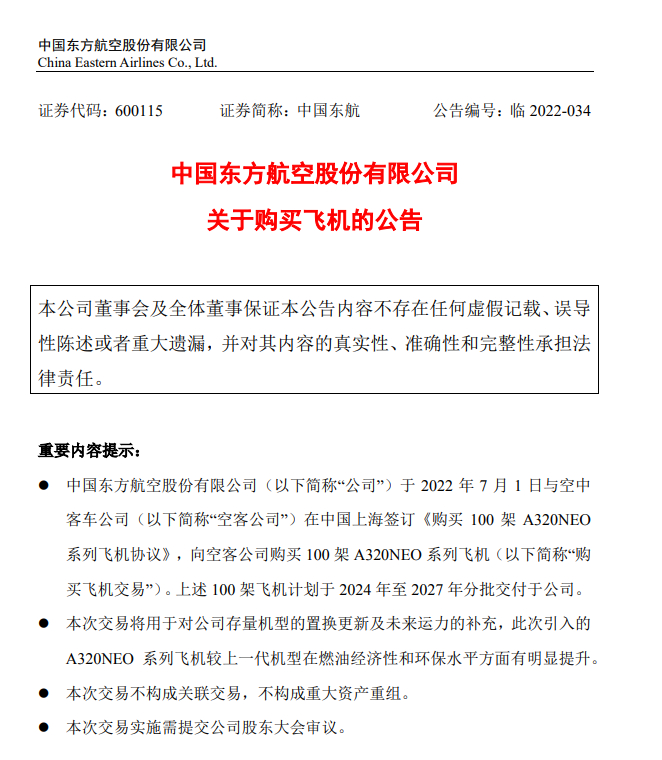 此外, 中国东航 也于7月1日发布公告,公司与空中公司在中国上海签订《购买100架A320NEO系列飞机协议》,向空客公司购买 100架A320NEO系列飞机。