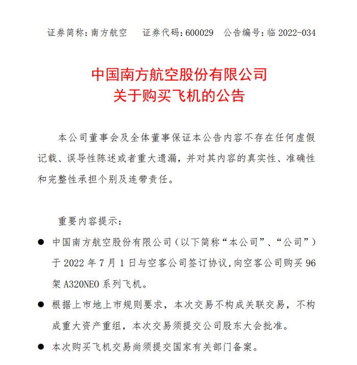 7月1日, 中国国航 发布公告,公司及全资子公司国航进出口有限公司(简称“国航进出口公司”)与空中客车公司(简称“空客公司”)于2022年7月1日签订国航购置协议,向空客公司购买64架空客A320NEO系列飞机 。