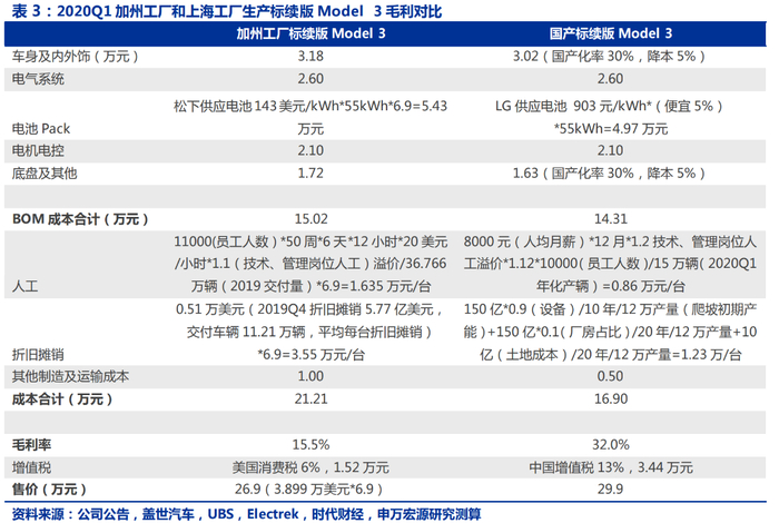 据申万宏源证券测算,加州工厂标续版Model 3成本21.21万元,上海工厂标续版Model 3成本16.90万元。2020Q1美国地区标续版Model 3售价3.899万美元(约合26.9万元),中国地区Model 3售价(补贴后)29.9万元。据此可得2020Q1加州弗里蒙特工厂毛利率约为 15.5%,上海工厂毛利率约 32.0%。