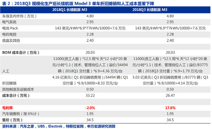 申万宏源证券进一步通过成本拆解的方式,发现规模化量产带来的单车固定资产折旧/摊销成本下降,帮助Model3从2018年Q1毛利率的-2.0%提升至Q3的17.6%,半年内毛利率提升了近20%。