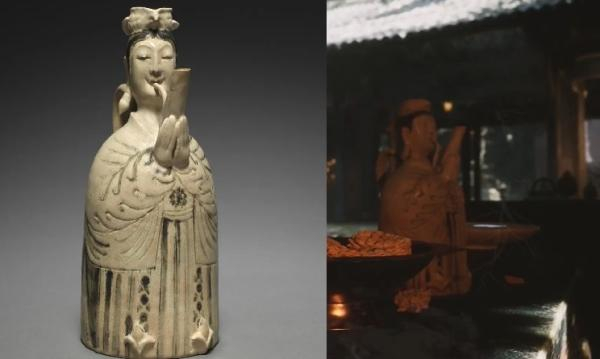 而在插曲《戒网》的mv中,桌上还放置着一只人形的壶,造型是一个抱着乐器的仙人,仙人的身体是容器,手中的乐器则是出水口。这个壶几乎与现藏于美国克利夫兰艺术博物馆的辽代仙人吹笙执壶一模一样。