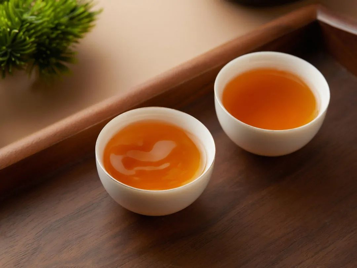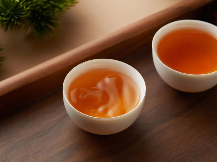 茶汤橙黄透亮,水香饱满,清澈浓稠。香气馥郁有兰花香,香高而持久,醇厚回甘,“岩韵”明显。