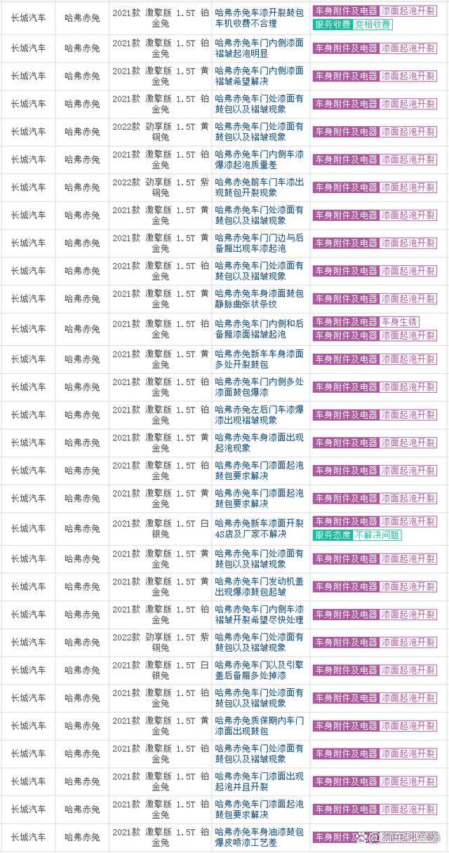 哈弗赤兔出现集中投诉:漆面开裂起泡成通病