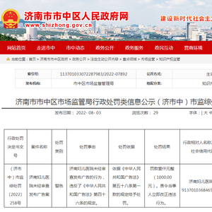 中国质量新闻网讯 近日,济南市市中区人民政府网公示的行政处罚信息显示,济南妇儿医院因未经审查发布广告,违反了《中华人民共和国广告法》第四十六条的规定,被罚款1000元,被责令立即改正违法行为。