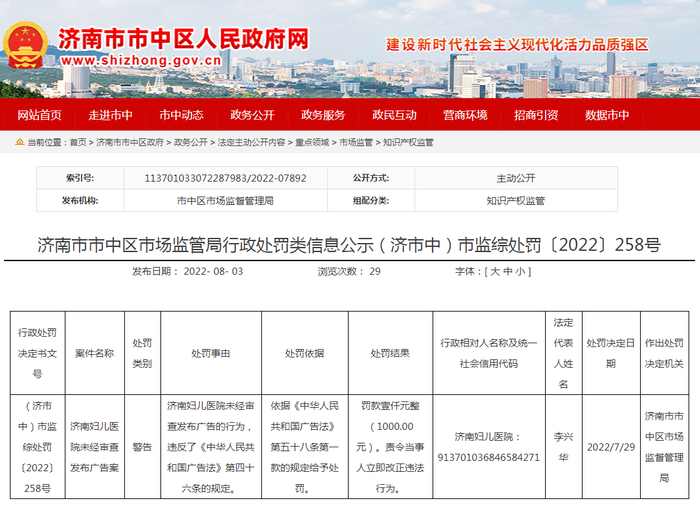 济南妇儿医院未经审查发布广告吃罚单