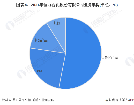 公司致力于打造从“原油—芳烃、烯烃—PTA、乙二醇—聚酯—民用丝、工业丝、薄膜、塑料”世界级全产业链一体化协同的上市平台发展模式。从公司2021年业务架构来看,炼化产品占比最高,达53%,其次是PTA及聚酯产品,共计占比达38.11%。