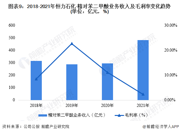 从精对苯二甲酸业务的经营情况来看,近四年精对苯二甲酸业务收入呈先下降后上升趋势。2021年公司精对苯二甲酸业务收入升至481.6亿元,较上年度同比增长64%。
