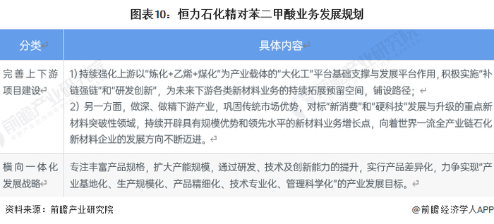 恒力石化主要从项目建设等方面对精对苯二甲酸业务的发展提出了相应的规划。在未来的发展中,恒力石化将继续完善上下游项目建设,上游强化“炼化+乙烯+煤化”为产业载体的“大化工”平台基础支撑,做深、做精下游产业。除此之外,公司将持续推动横向一体化发展战略,专注丰富产品规格,扩大产能规模,通过研发、技术及创新能力的提升,实行产品差异化。具体发展规划如下: