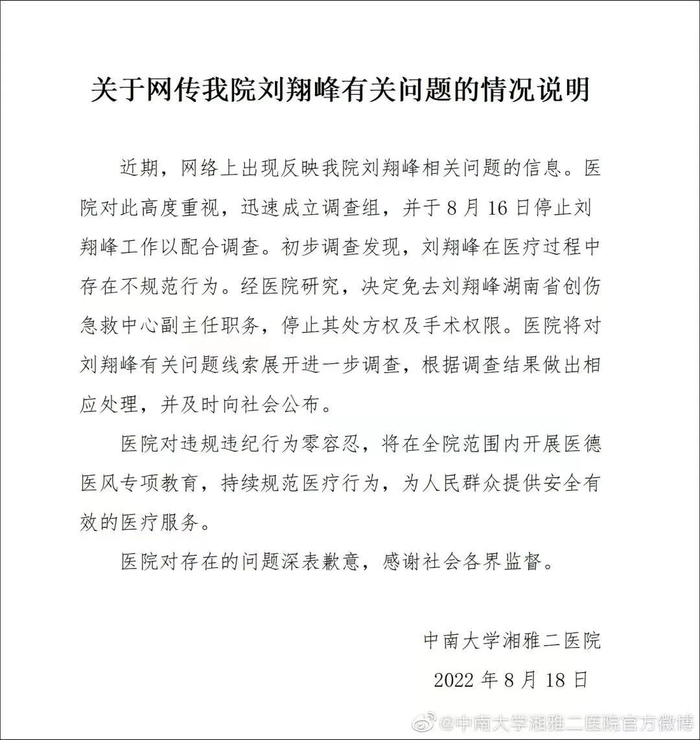 事发不久,湘雅二院作出回应,承认刘翔峰在医疗过程中“存在不规范行为”,已免去其湖南省创伤急救中心副主任职务,停止其处方权及手术权限,并对相关问题线索展开进一步调查。从这份回应看,网络举报并非凭空捏造。