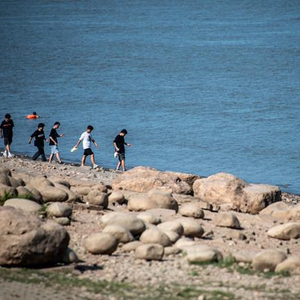 长江武汉段出现历史同期最低水位。8月15日,武汉市民在汉口江滩滩涂游玩。新华社图